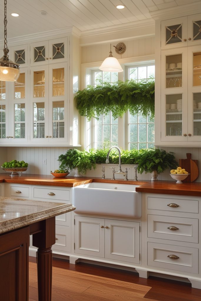 Muted paint colors like navy, dove gray, or soft sage work beautifully alongside natural materials such as wood or marble. Adding a farmhouse sink, decorative range hood, or polished nickel hardware reinforces the timeless charm. Meanwhile, integrated appliances and sleek countertops ensure a smooth, up-to-date finish.
