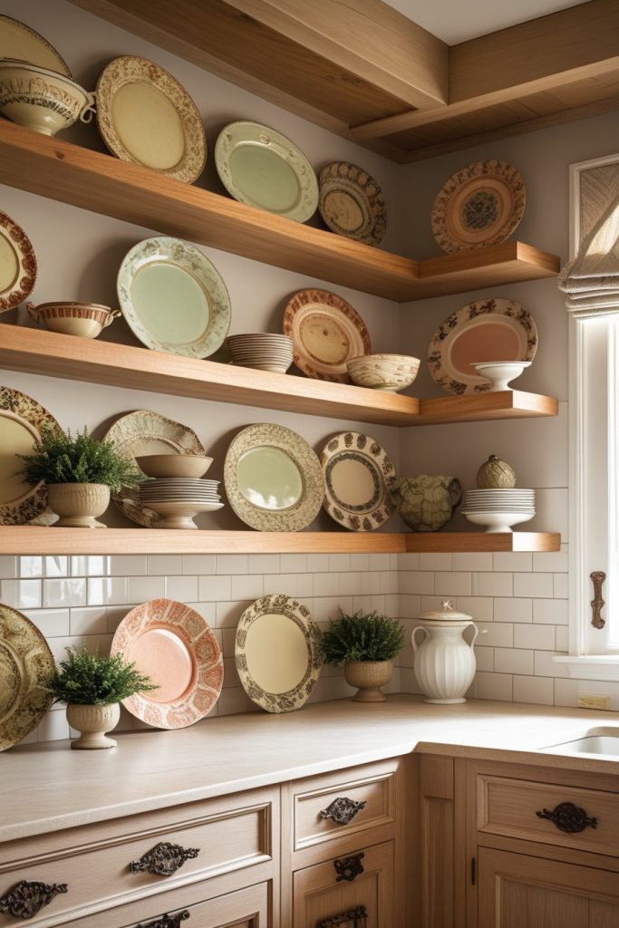 For a cohesive look, use floating wooden shelves or iron brackets. Keep the display balanced—mix everyday items with decorative touches like small vases, cutting boards, or woven baskets. The result is an approachable yet refined kitchen aesthetic that feels lived-in and personal.