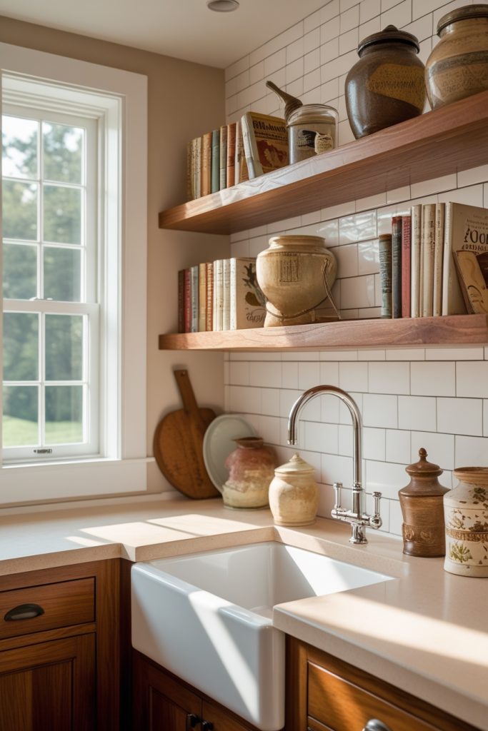 Open shelving offers a perfect mix of form and function. It allows you to display beautiful dishware, cookbooks, or greenery while keeping essentials within easy reach. When combined with timeless materials like white subway tiles and neutral cabinetry, open shelving feels both modern and classic.