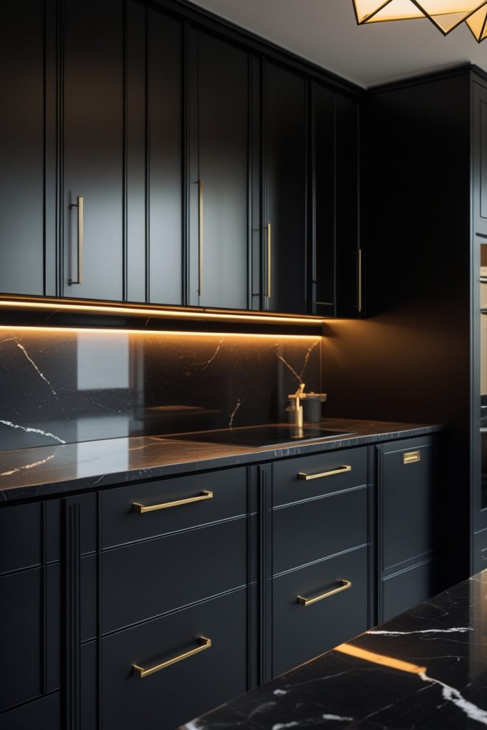 Matte black cabinetry paired with white-veined marble countertops creates a refined, high-contrast look. Gold or brass hardware and light fixtures introduce warmth, while wood accents—like open shelving or a butcher block island—soften the palette.