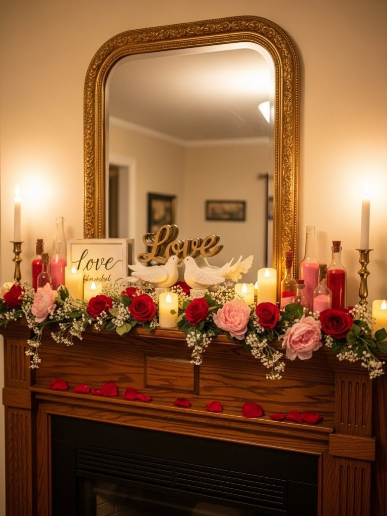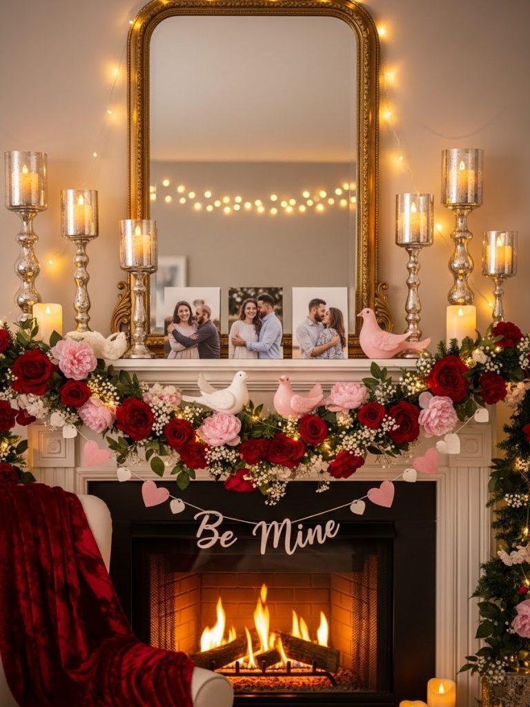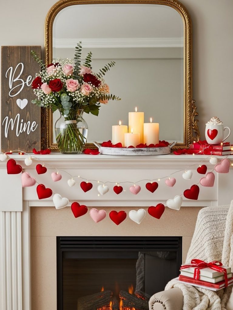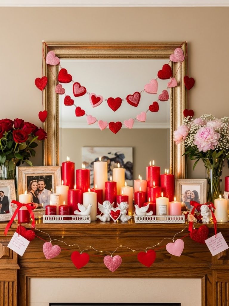 Don’t forget the little details! The scattered rose petals and the delicate branches with tiny hearts bring warmth and a romantic feel. This mantel decor is perfect for setting the mood during Valentine’s celebrations.