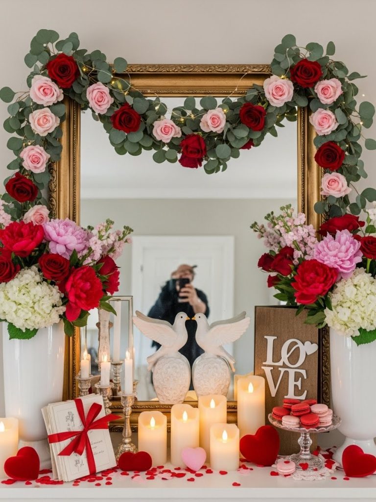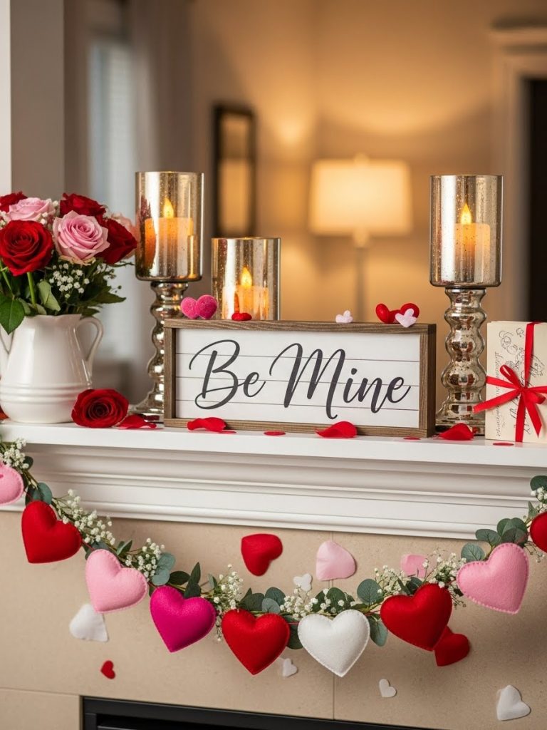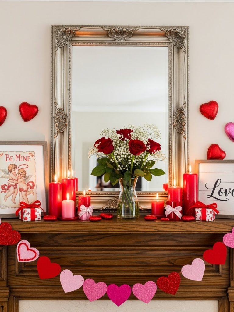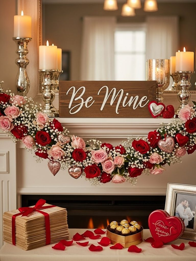 Don’t forget the little details! The scattered rose petals and the delicate branches with tiny hearts bring warmth and a romantic feel. This mantel decor is perfect for setting the mood during Valentine’s celebrations.