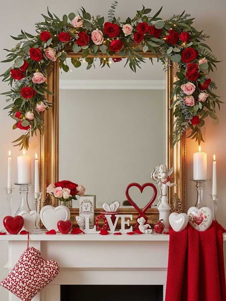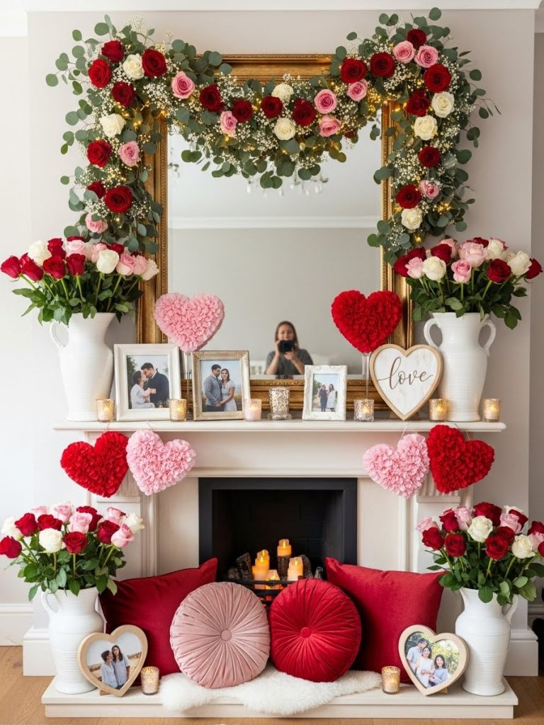 Heart-shaped wreaths make a charming addition to your Valentine’s mantle decor. They instantly bring warmth and love into your space. The one in the image features a delightful mix of roses and greenery, creating a vibrant and inviting look.