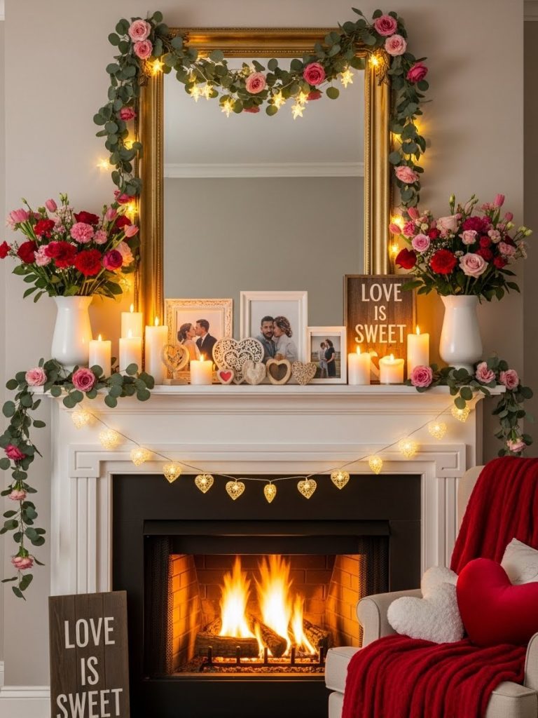 The mantle is adorned with a charming garland, enhancing the cozy vibe. Below, a small chalkboard with a playful message adds a fun element, reminding us that love can be light-hearted too. This setup is perfect for celebrating Valentine’s Day or simply enjoying the warmth of love every day.