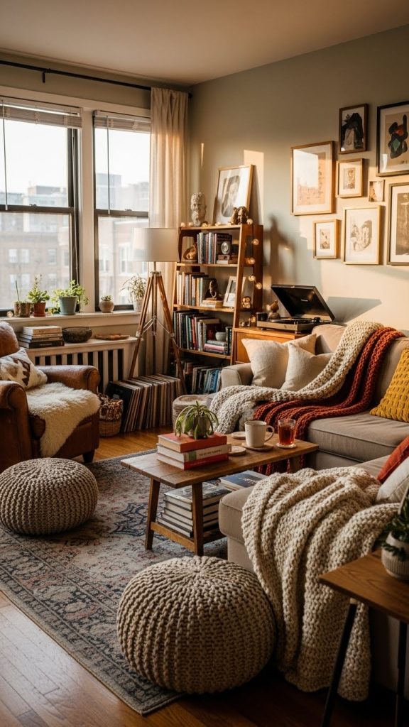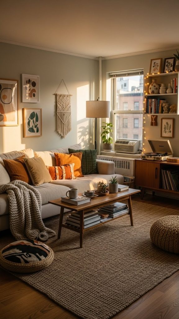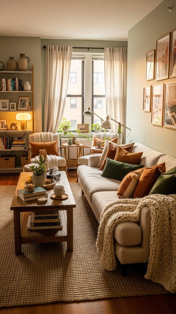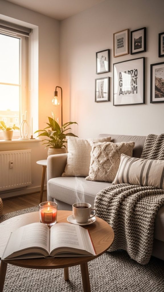 Creating a warm apartment aesthetic often starts with the right textiles. In the image, you can see a cozy sofa adorned with a mix of soft pillows and a chunky knit throw. These elements invite you to sink in and relax, making the space feel welcoming.