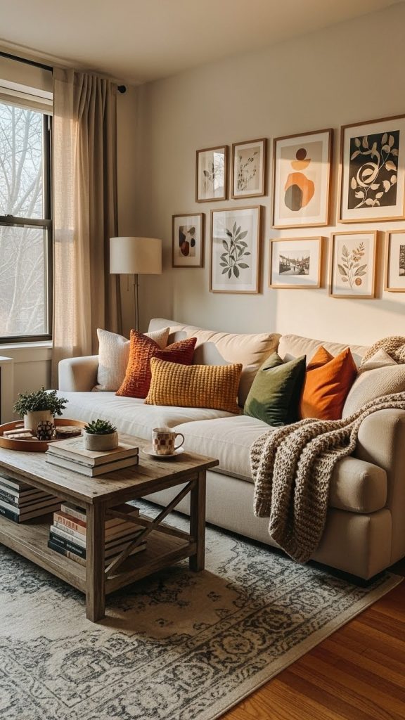 Seasonal decor can really bring a cozy vibe to your apartment. In the image, you can see a warm and inviting living space filled with autumn colors. The rich reds and oranges from the leaves and decorations create a cheerful atmosphere.