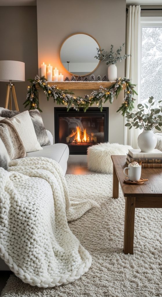 Don’t forget about the rug! A soft, fluffy rug underfoot can make a huge difference. It not only adds warmth but also creates a cozy spot for your feet. Layering different textures can enhance the overall look, making your living room a true winter retreat.